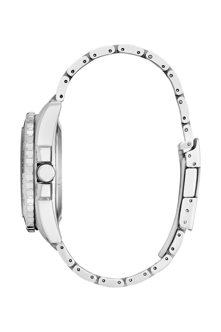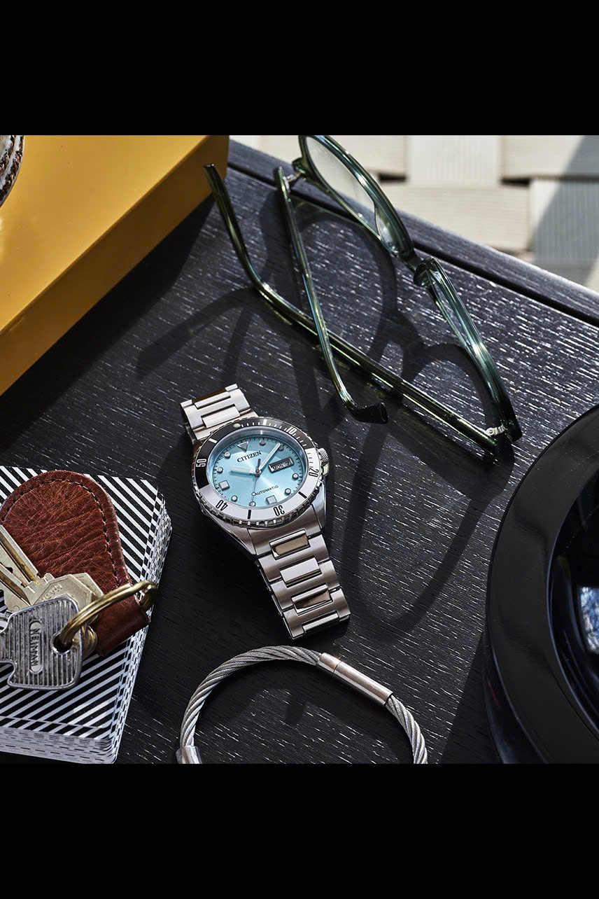 Vỏ và dây đeo bằng thép không gỉ tông màu bạc. Vành thép không gỉ màu đen/bạc xoay một chiều. Mặt số màu xanh nhạt với kim và vạch chỉ giờ tông màu bạc. Vạch chỉ phút xung quanh vành ngoài. Kiểu mặt số: Analog. Kim và vạch chỉ giờ phát quang. Hiển thị ngày và thứ trong tuần ở vị trí 3 giờ. Bộ máy tự động Citizen Calibre 8200. Mặt kính sapphire chống xước. Mặt sau trong suốt, có thể nhìn xuyên qua. Hình dạng vỏ tròn, kích thước vỏ: 42 mm. Chiều rộng dây đeo: 22 mm. Khóa gập có chốt an toàn. Chống nước ở độ sâu 100 mét / 330 feet. Chức năng: ngày, thứ, giờ, phút, giây. Dòng Sport Automatic. Kiểu đồng hồ thể thao. Nhãn đồng hồ: Japan Movt. Đồng hồ nam Citizen Sport Automatic NH7530-52L.