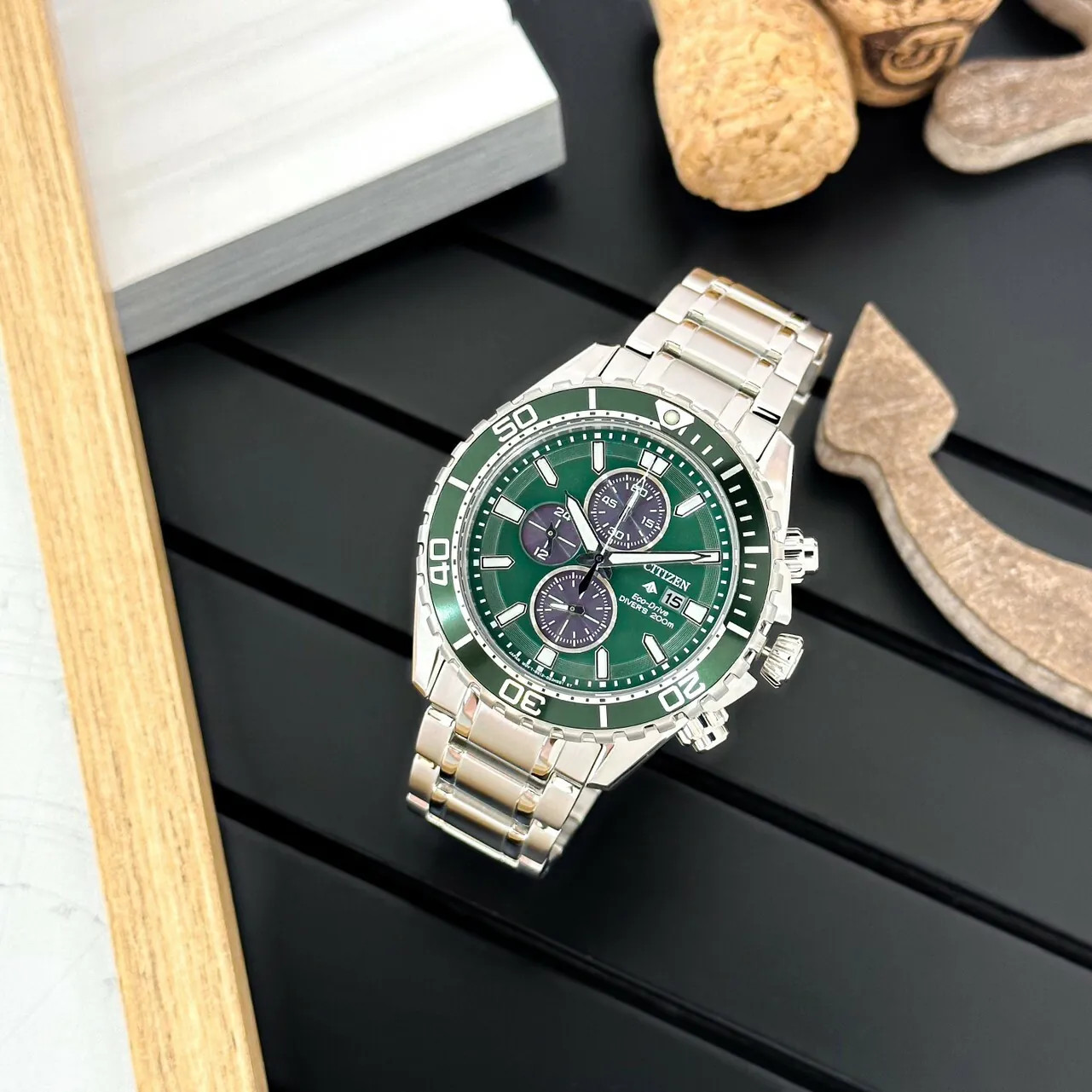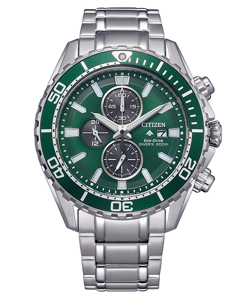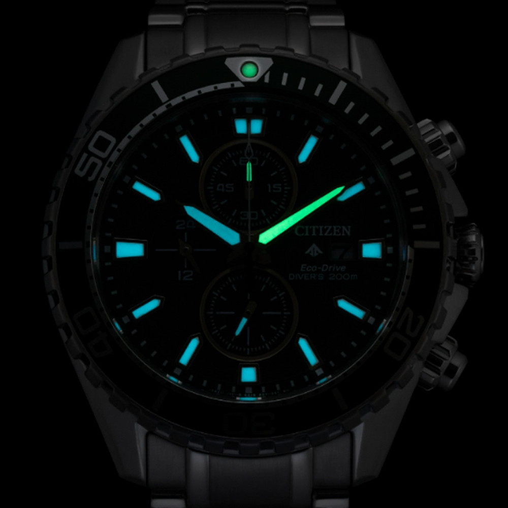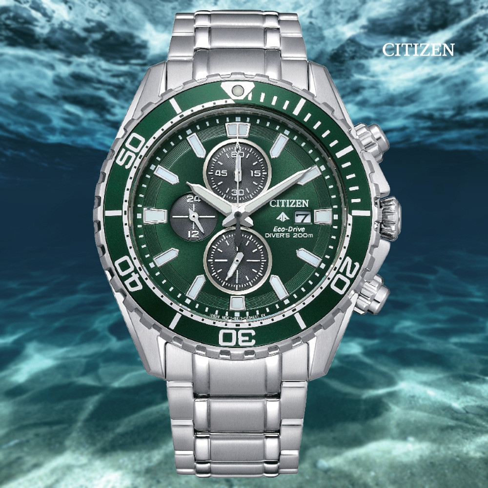 CITIZEN Promaster CA0820-50X – mẫu nam xuất xứ từ Nhật Bản, sử dụng bộ máy Eco-Drive độc quyền của hãng Citizen, chuyển hóa mọi nguồn sáng thành năng lượng, không cần thay pin thường xuyên (5-7 năm). Chuẩn đồng hồ lặn với niềng bezel xoay linh hoạt. Tính năng Chronograph bấm giờ thể thao năng động. Màu xanh chủ đạo nam tính, cuốn hút. Vỏ và dây đồng hồ bằng thép không gỉ 316L cao cấp chắc chắn, bền bỉ. Bộ kim và cọc số dạ quang, hỗ trợ xem giờ trong điều kiện thiếu sáng. Chống nước 200m thoải mái bơi lặn.