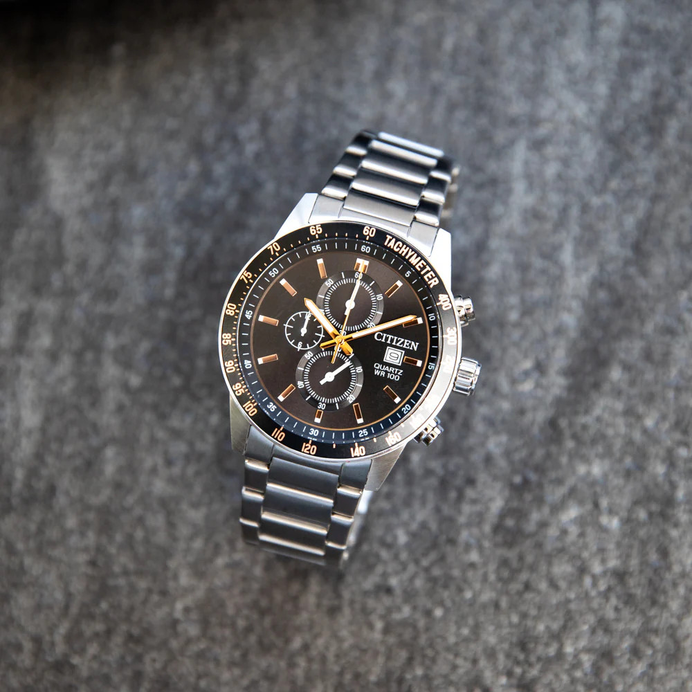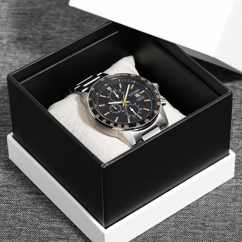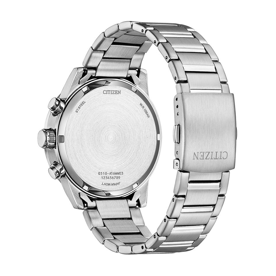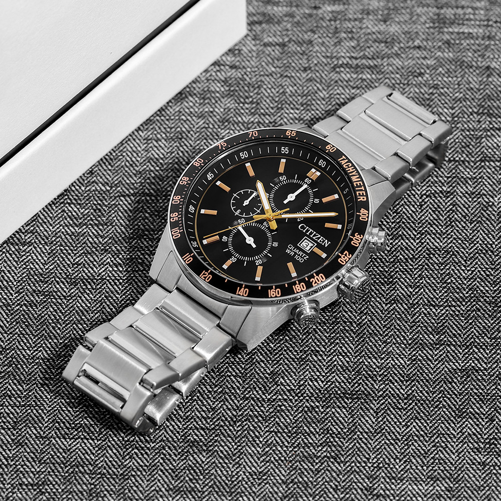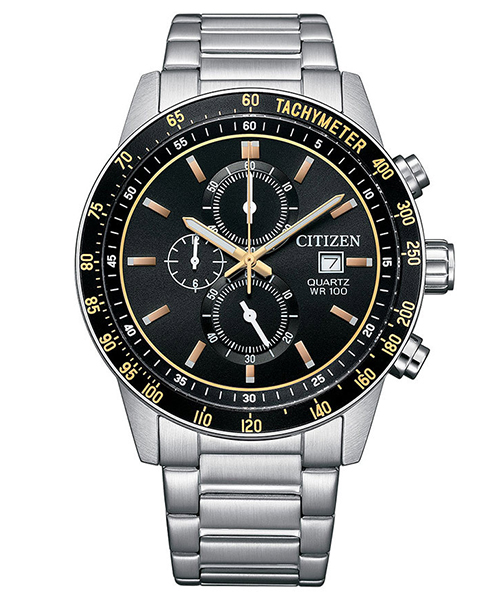 Đồng hồ CITIZEN Quartz Chronograph AN3681-57E – mẫu nam xuất xứ từ Nhật Bản, sử dụng bộ máy pin hoạt động chính xác và bền bỉ. Tính năng Chronograph bấm giờ thể thao năng động. Mặt kính khoáng cứng chịu lực tốt. Vỏ và dây được làm từ chất liệu thép không gỉ 316L cao cấp. Khả năng chống nước là 100M có thể đi mưa và rửa tay.