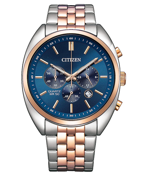 Đồng hồ CITIZEN Quartz Chronograph AN8216-50L mẫu nam xuất xứ từ Nhật Bản, sử dụng bộ máy pin hoạt động chính xác và bền bỉ. Tính năng Chronograph bấm giờ thể thao năng động. Mặt kính khoáng cứng chịu lực tốt. Vỏ và dây được làm từ chất liệu thép không gỉ 316L demi mạ vàng hồng PVD cao cấp. Khả năng chống nước là 50M có thể đi mưa và rửa tay.