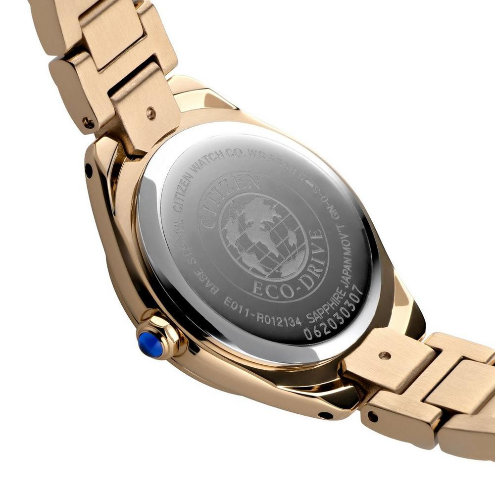 Đồng hồ CITIZEN Eco-Drive EW2543-85D mẫu nữ xuất xứ từ Nhật Bản, sử dụng bộ máy Eco-Drive độc quyền của hãng Citizen, chuyển hóa mọi nguồn sáng thành năng lượng, không cần thay pin thường xuyên (5-7 năm). Mặt kính Sapphire chịu lực tốt. Vỏ và dây được làm từ chất liệu thép không gỉ 316L mạ vàng PVD cao cấp. Khả năng chống nước là 50M có thể đi mưa và rửa tay.