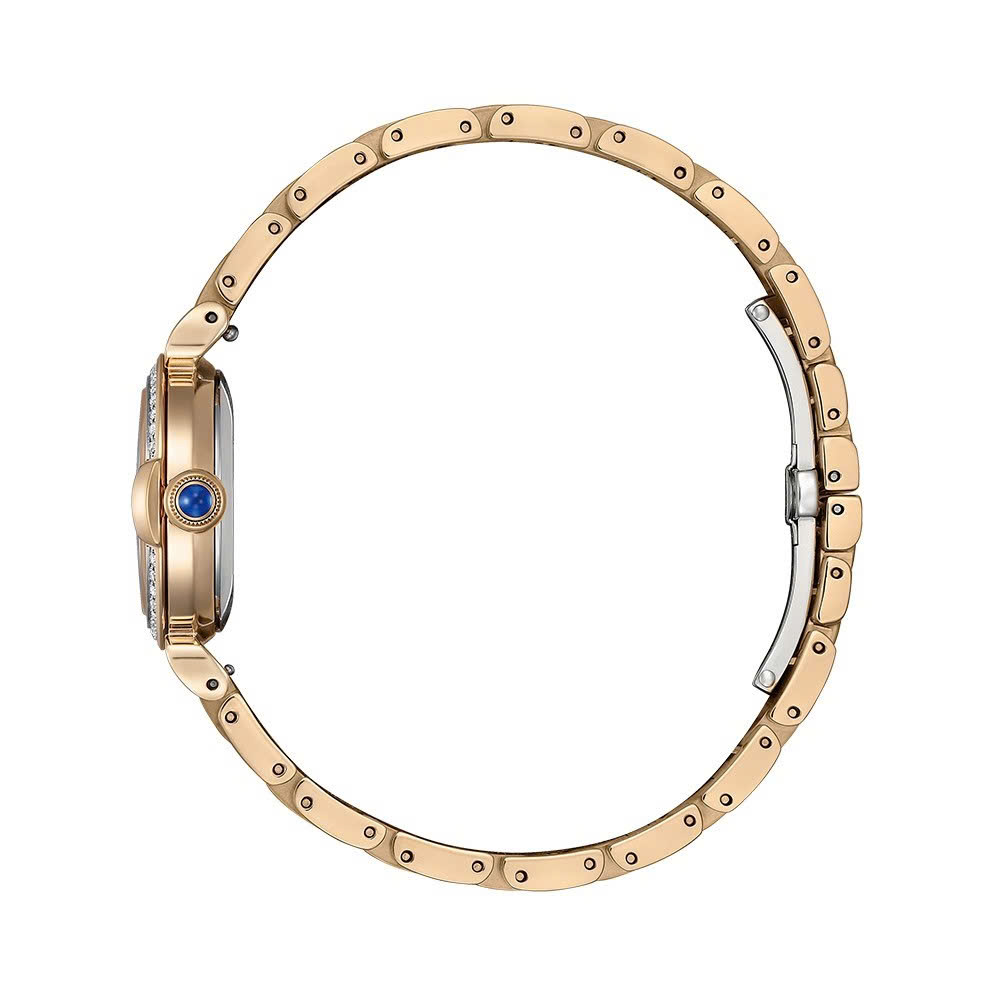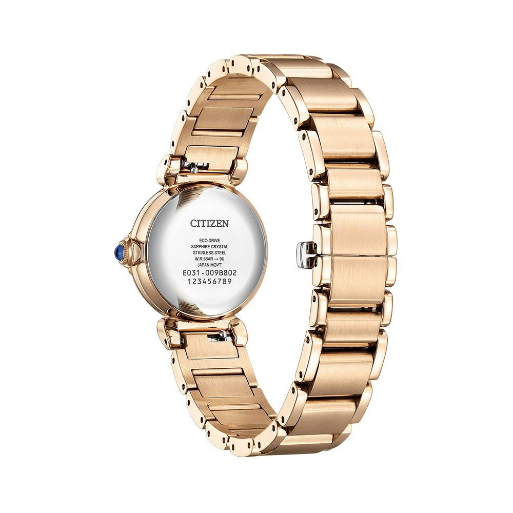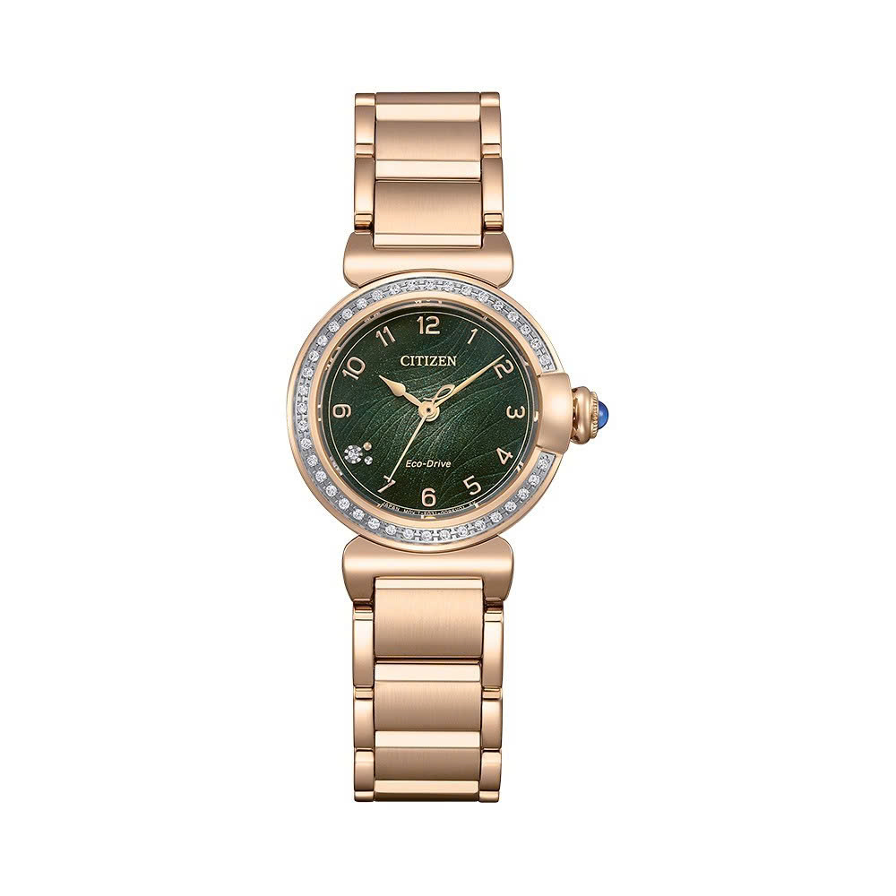 Citizen L EM1123-62X mang đến vẻ đẹp nữ tính và sang trọng với mặt số xanh lá, kết hợp cùng thiết kế mạ vàng hồng PVD và kim cương đính tinh tế. Đồng hồ có kích thước nhỏ gọn 26mm x 8.1mm, phù hợp với cổ tay thanh mảnh.