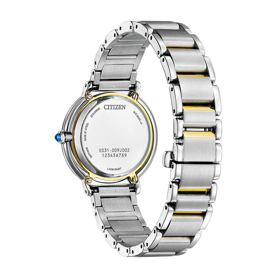 CITIZEN L EM1104-83D – mẫu nữ xuất xứ từ Nhật Bản, sử dụng bộ máy Eco-Drive độc quyền của hãng Citizen, chuyển hóa mọi nguồn sáng thành năng lượng, không cần thay pin thường xuyên. Vỏ và dây được làm bằng thép không gỉ 316L demi mạ vàng PVD cao cấp chắc chắn, bền bỉ. Mặt kính Sapphire chịu lực tốt; khả năng chống nước 50m đủ để chịu nước khi đi mưa và rửa tay.