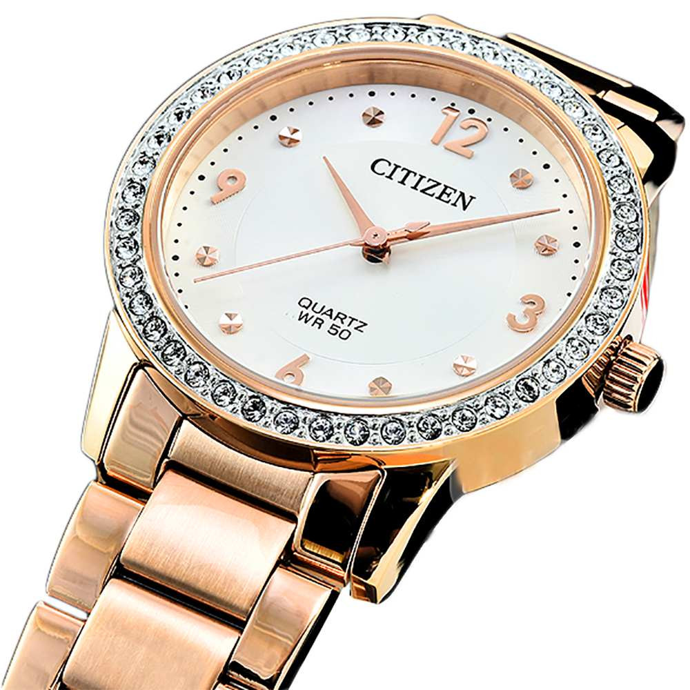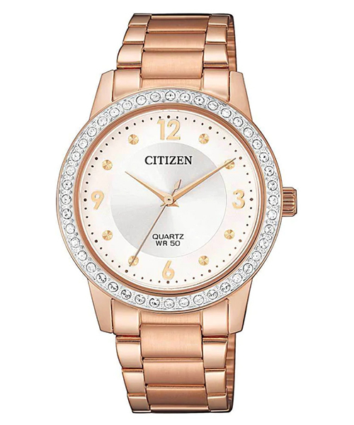 CITIZEN Quartz EL3093-83A – mẫu nữ xuất xứ từ Nhật Bản, sử dụng bộ máy pin hoạt động chính xác và bền bỉ. Với kiểu dáng độc đáo, vỏ và dây được làm bằng chất liệu thép không gỉ 316L mạ vàng hồng PVD sang trọng dành cho các quý cô, viền đính đá Swarovski. Mặt kính khoáng cứng chống trầy xước, khả năng chống nước là 50M có thể đi mưa và rửa tay.